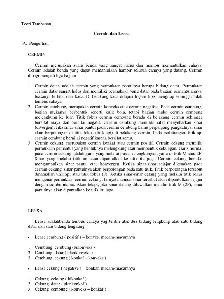 1 sebuah benda yang tingginya 4 cm berada 8 cm di depan sebuah cermin cekung. Pemantulan dan pembiasan pada cermin (cekung,cembung) dan lensa (cekung,cembung) refleksi (atau pemantulan) adalah perubahan arah rambat cahaya ke arah sisi ( medium) asalnya, setelah menumbuk antarmuka dua medium. lensa cembung disebut juga lensa positif. A) jarak bayangan b) perbesaran bayangan c) tinggi bayangan d) sifat bayangan pembahasan Untuk gambar ini, bagian depannya di sebelah kiri, belakangnya sebelah kanan. Jika jarak benda adalah 12 cm, tentukan jarak titik fokus lensa tersebut. Benda yang tingginya 5 cm terletak di sebelah kiri lensa tersebut. Ketiga lensa tersebut memiliki sifat dan kegunaan yang berbeda beda. Sifat bayangan yang terbentuk pada lensa cekung, apabila benda terletak di depan lensa maka bayangan yang dihasilkan akan selalu bersifat maya, tegak, diperkecil, dan terletak didepan lensa. Sifat bayangan pada lensa cembung dan cekung. Lembar kerja laporan praktikum ipa sd pdgk4107 modul 1 8. Data pengamatan data pengamatan percobaan cermin cekung, cermin cembung, dan cermin datar dapat dilihat pada tabel 3.2 berikut tabel 3.2. 0,3 0,37 nyata, terbalik, diperkecil 3.